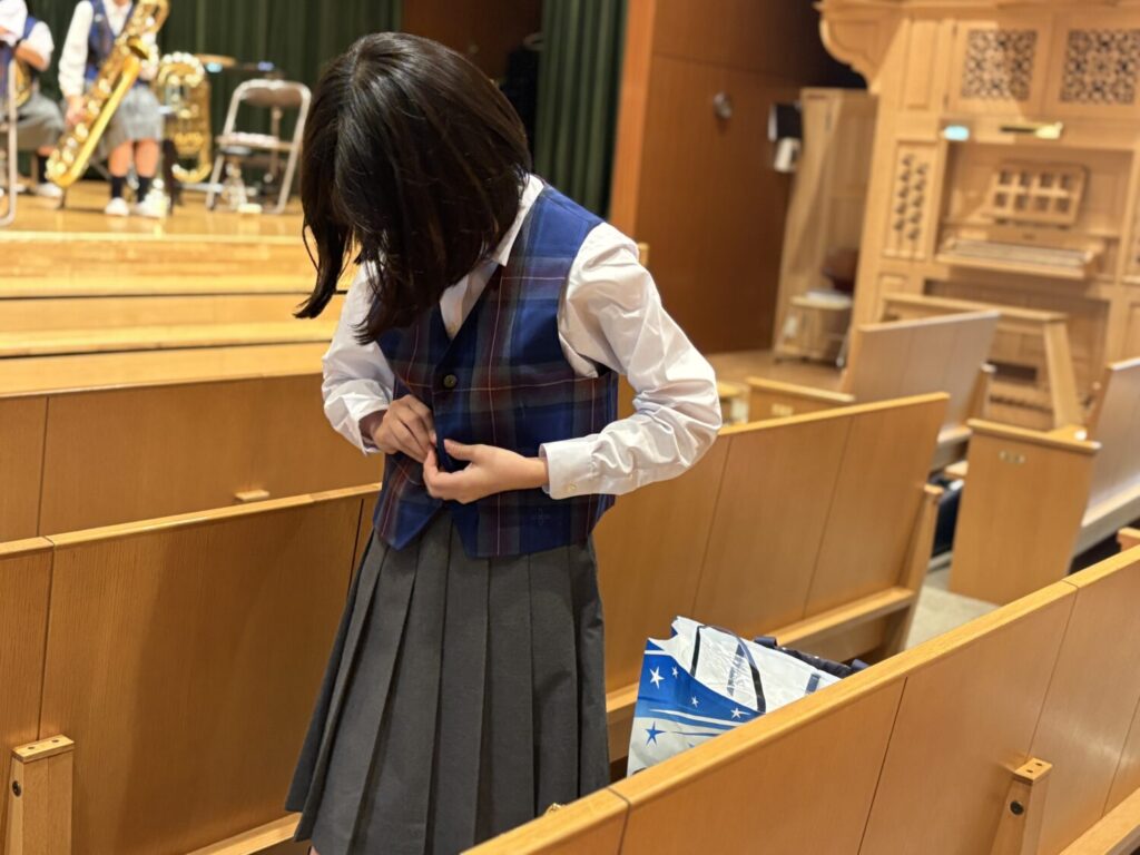 関東学院小学校オリジナルタータンのベストには校章が刺繍されていて、ブラスバンドの「誇り・責任・喜び」の象徴です。