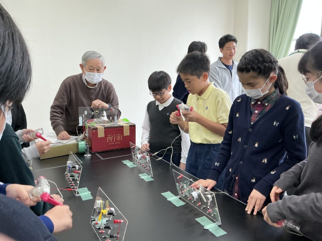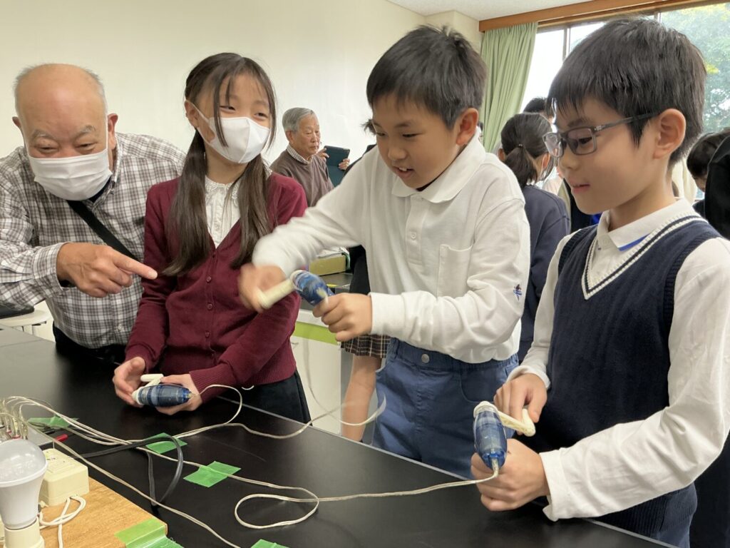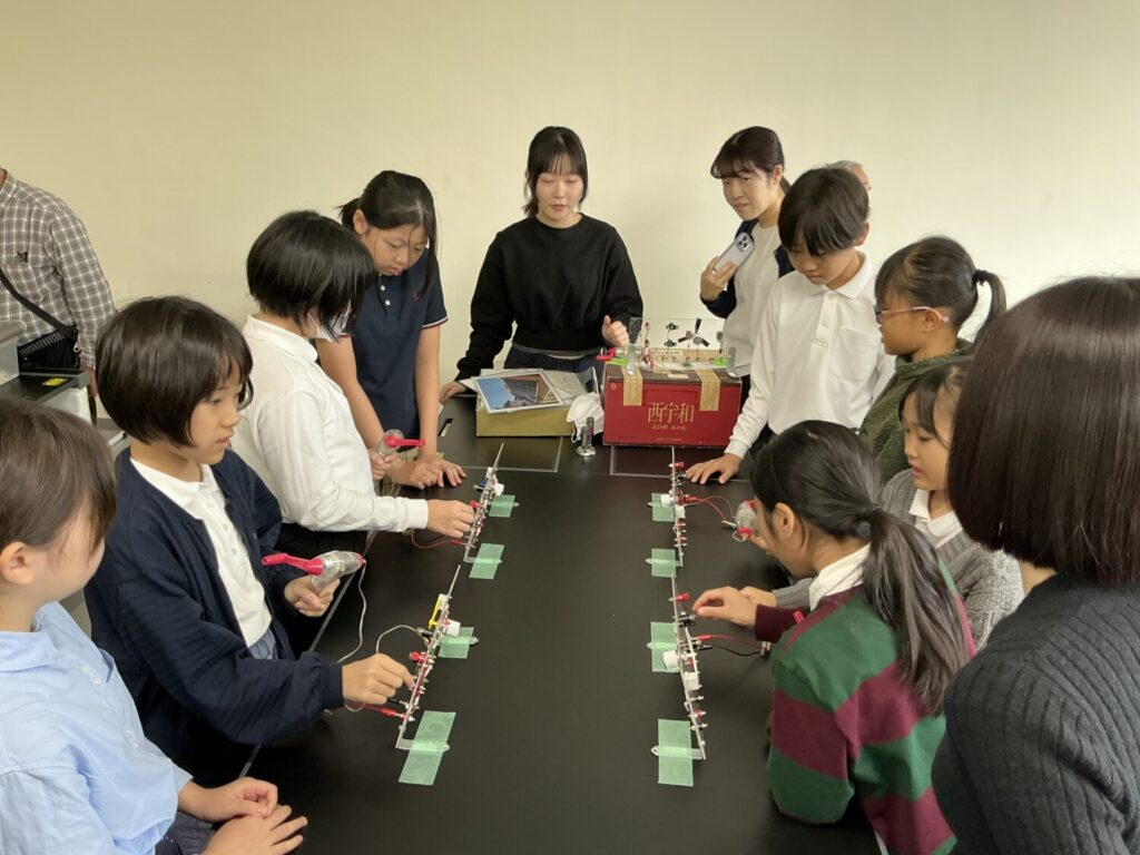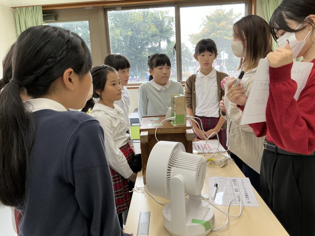 理科室に移動すると4つの実験コーナーが設けられていました。実験で体感しながら温暖化や気候変動の原因を知り、省エネを考えていきます。