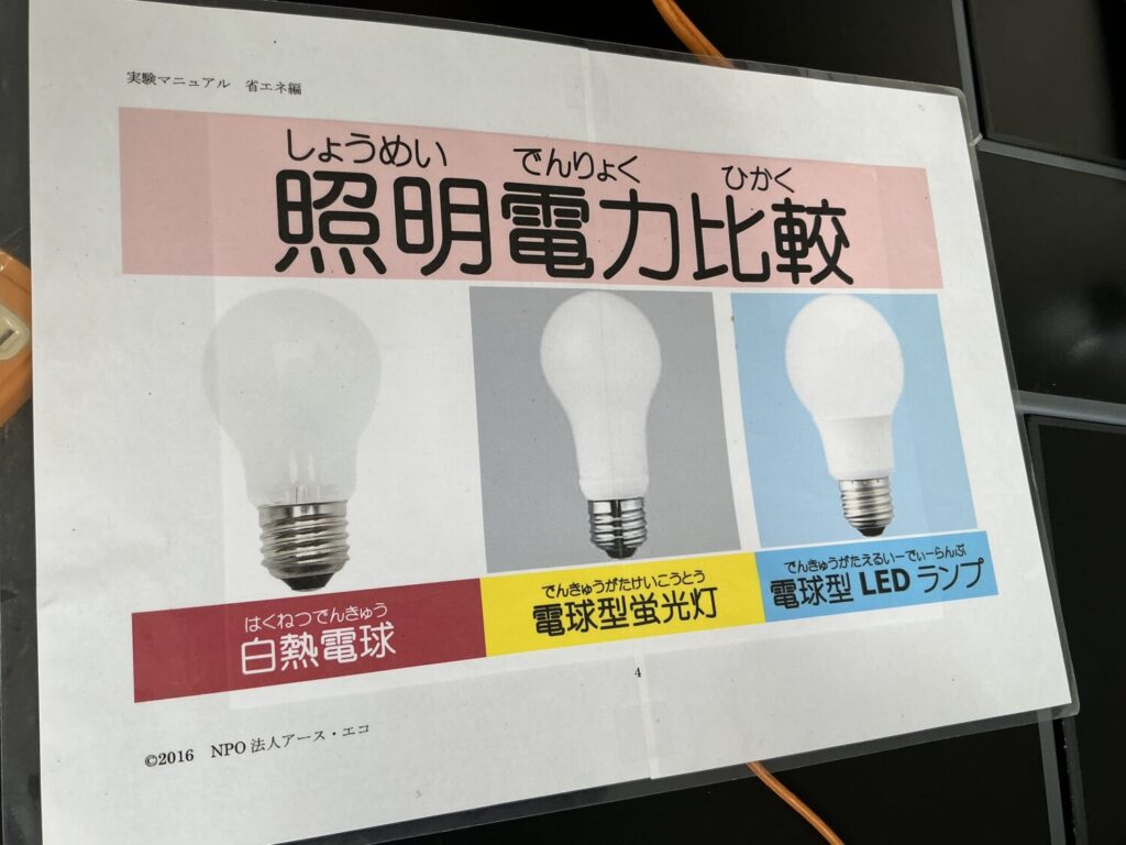 白熱電球、蛍光灯、LED電球の消費電力を比べるコーナーでは