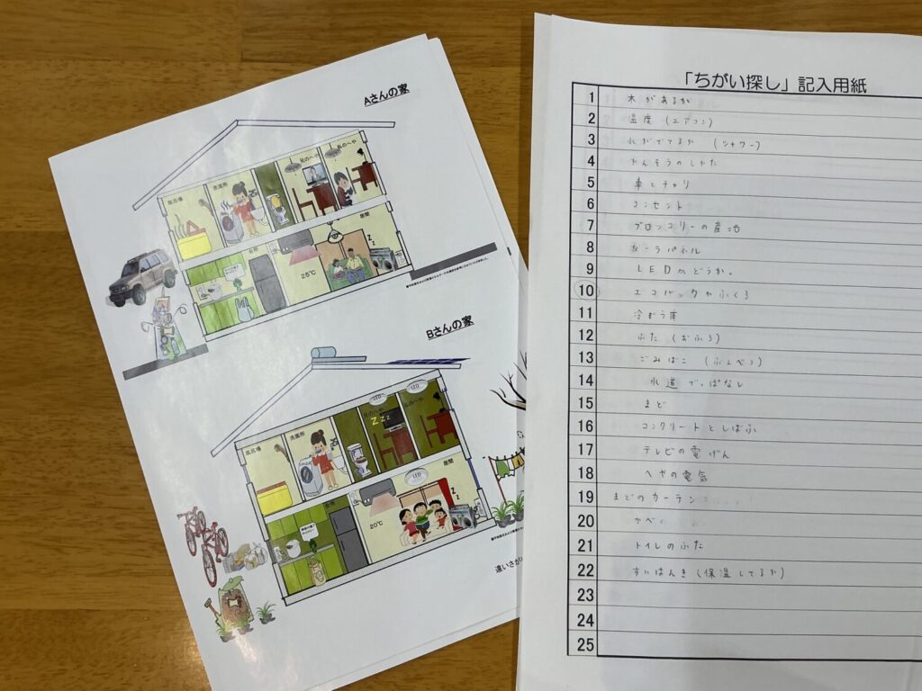 実験で学んだことをふまえて、「違い探しゲーム」で身近な省エネ対策を見つけていきます。