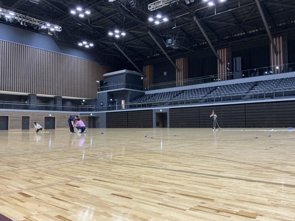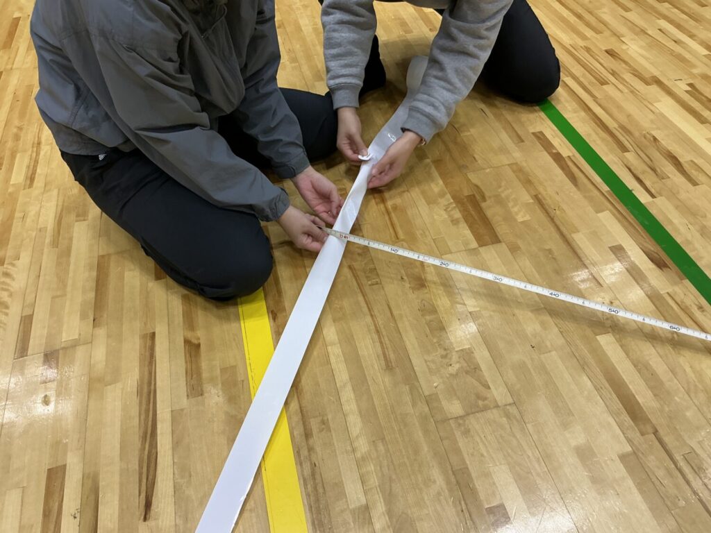 準備図とアリーナのラインとを見比べている準備係の子どもたち。