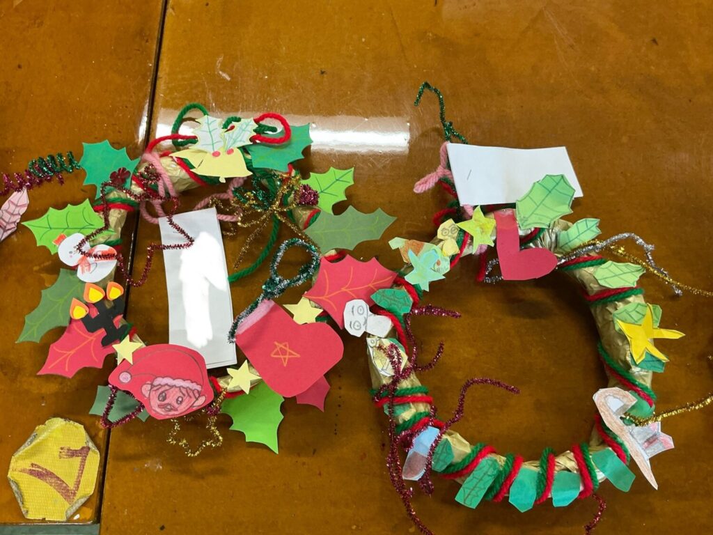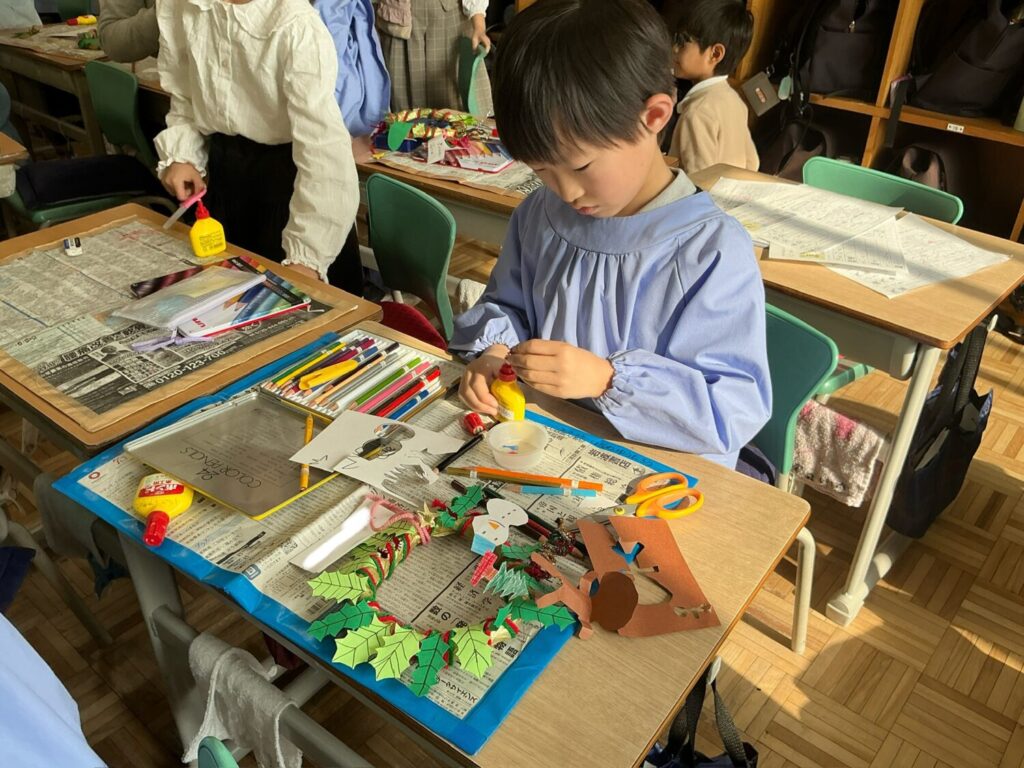 2年生は造形の授業でオリジナルのクリスマスリースを作りました。