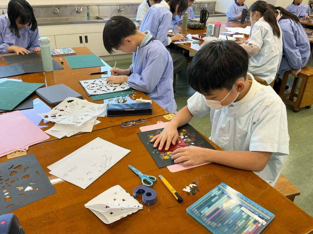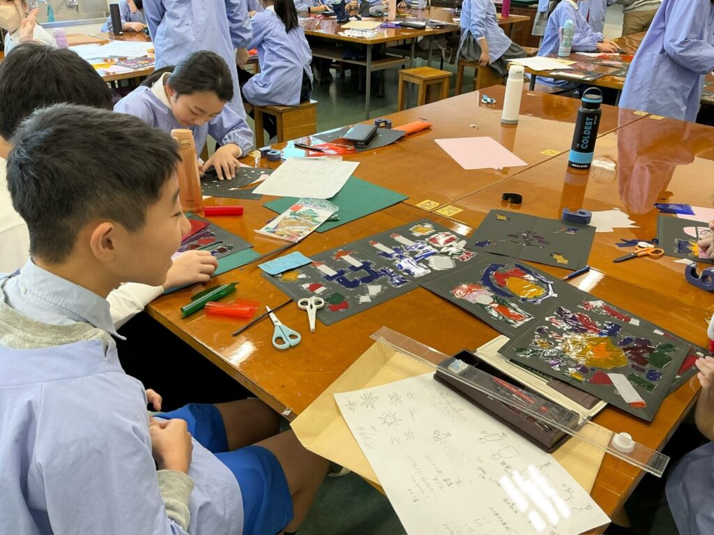 光が当たった時の色を想像して下書きをデザインし、カットして色セロファンを貼っていきます。