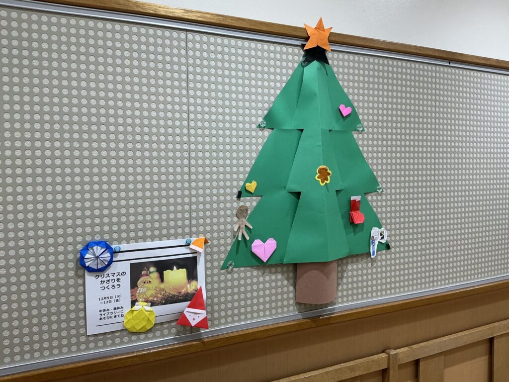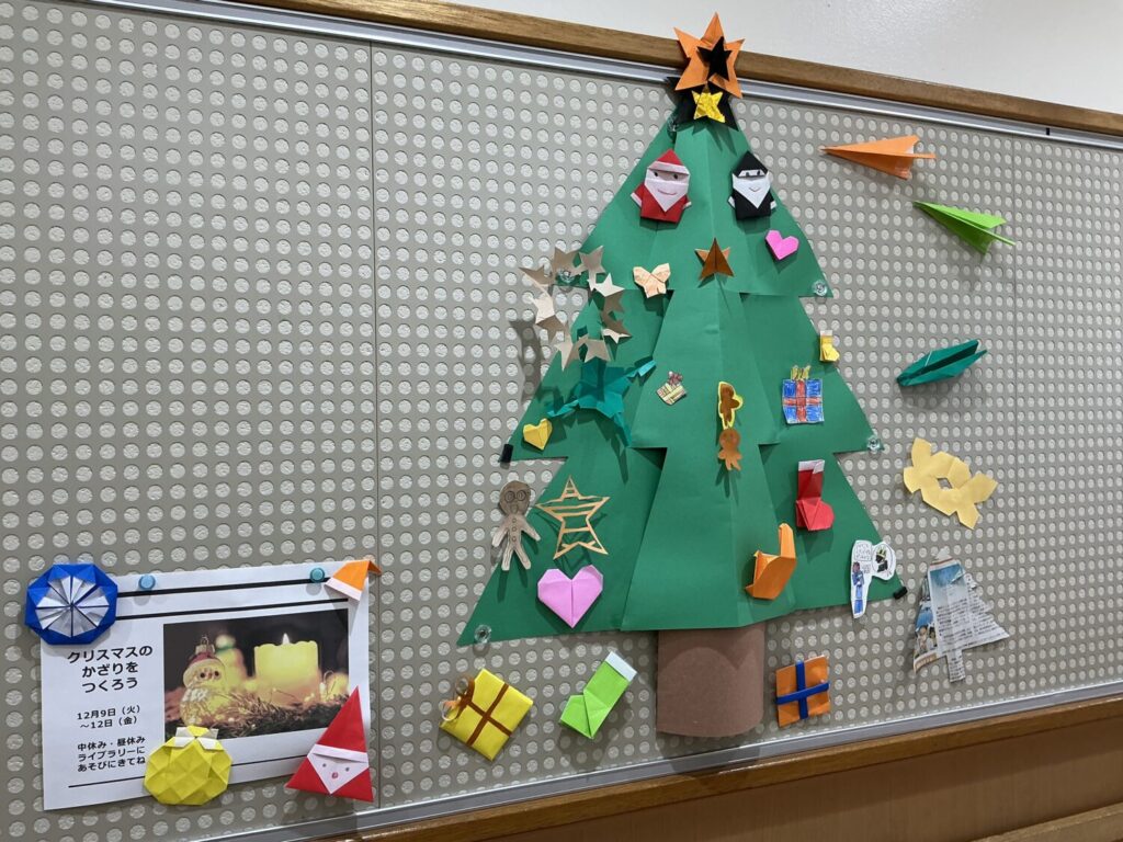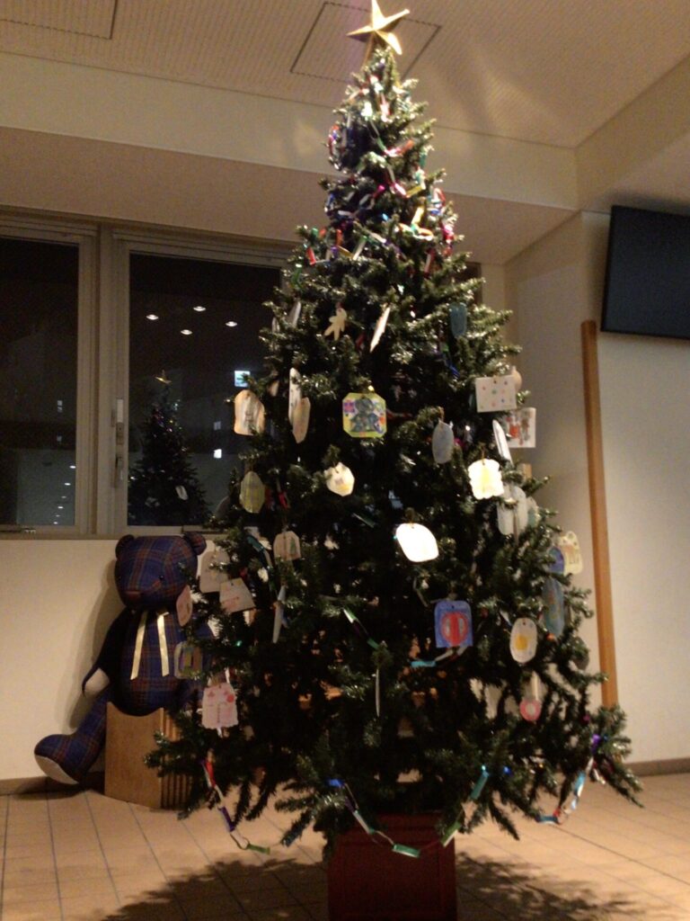 ライブラリーの前のクリスマスツリーは子どもたちの作ったオーナメントが飾られて