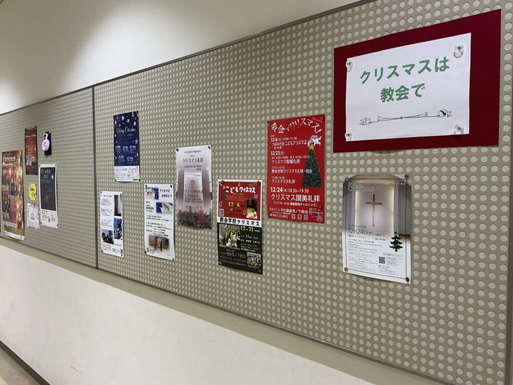 2階教員室前には、近隣教会から届いたクリスマス礼拝へのお誘いが掲示されています。